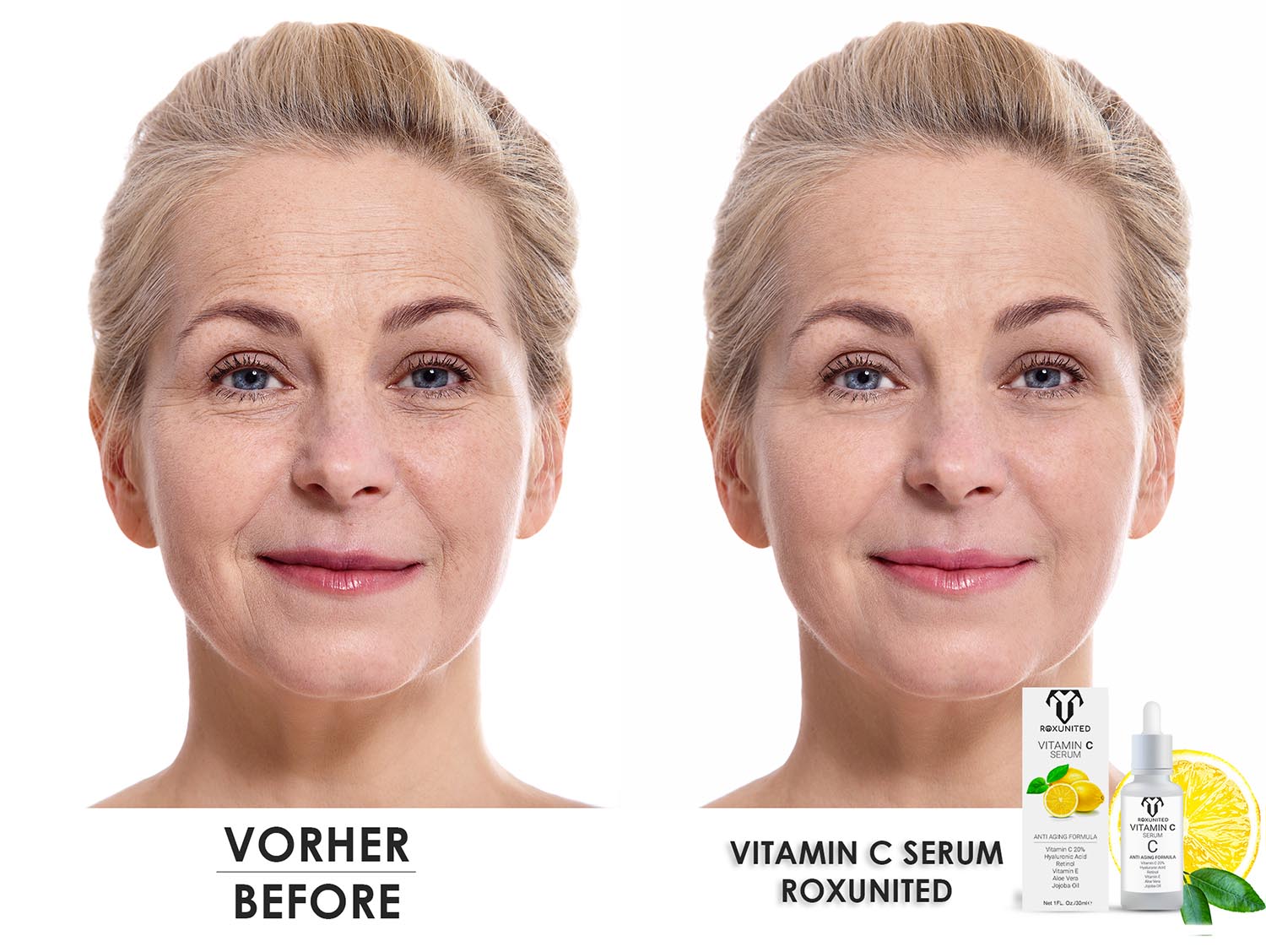 ROXUNITED COSMETICS Vitamin C Serum Vergleichssieger Retinol Hyaluronsäure hochdosiert Anti-Aging Bio Vegan Vitamin E Anti Falten Feuchtigkeitspflege Gesicht Ausschließliche Verwendung von hochwertigen, naturreinen Inhaltsstoffen, die ohne synthetische Zusätze in der Tiefe wirken, für eine perfekte Langzeitpflege der Haut. Perfekte Konzentration: Verwendung von Vitamin C, der nach neuesten wissenschaftlichen Erkenntnissen maximal gesundheitsverträglichen Menge, für einen lang anhaltenden Anti-Aging-Effekt Sorgfältig komponierte Gesamtformel, perfekte Kombination der Inhaltsstoffe. Frei von Mikroplastik, Parabenen und anderen fragwürdigen Zusatzstoffen.